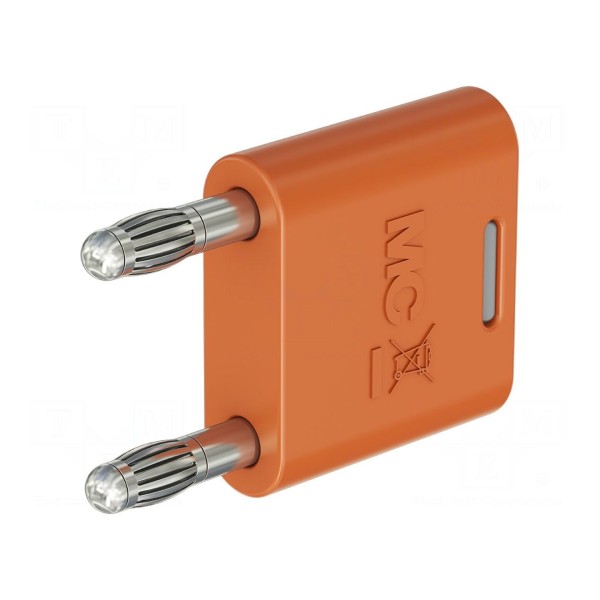Konstrukcja złącza obejmuje dwa gniazda bananowe 4mm oraz dwa wtyki bananowe 4mm. Produkt utrzymany jest w kolorze pomarańczowym.