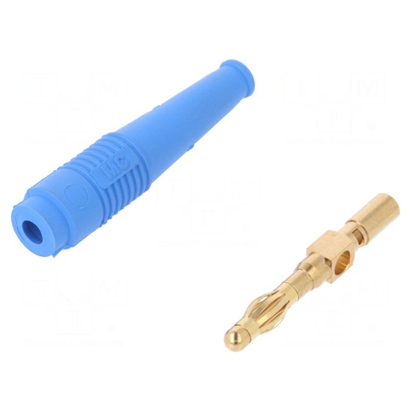 Element posiada pozłacane styki, które zapewniają stabilne połączenie elektryczne. Montaż przewodu o przekroju do 2,5mm² odbywa się poprzez lutowanie. Całkowita długość złącza wynosi 69mm, a obudowa wykonana jest w kolorze niebieskim.