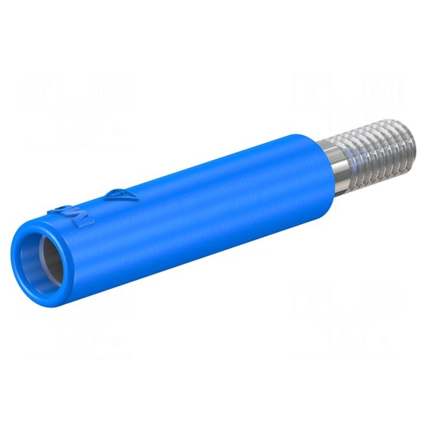 Styk wykonany jest z mosiądzu i poddany procesowi niklowania, co zapewnia parametry połączenia. Montaż odbywa się za pomocą gwintu M4 w sposób przykręcany, a całkowita długość komponentu wynosi 34,5mm. Produkt jest utrzymany w kolorze niebieskim.