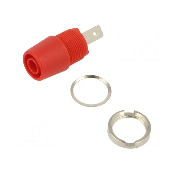 Gniazdo posiada izolowaną obudowę w kolorze czerwonym. Kontakt wykonano z mosiądzu z powłoką niklowaną, co zapewnia odpowiednie parametry połączeniowe.