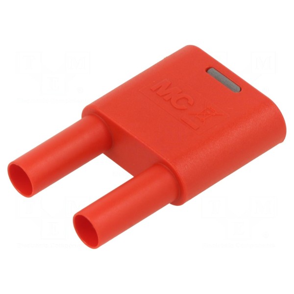 Konstrukcja złącza obejmuje dwa gniazda bananowe 4 mm oraz dwa wtyki bananowe 4 mm. Komponent jest zgodny z normami CAT II 1000V oraz EN 61010, co określa jego parametry bezpieczeństwa w środowisku laboratoryjnym. Element wykonany w kolorze czerwonym.