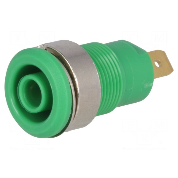 Złącze laboratoryjne typu bananowego o średnicy 4 mm występuje w wersji izolowanego gniazda w kolorze zielonym. Element charakteryzuje się prądem znamionowym na poziomie 24 A oraz napięciem znamionowym 1 kV. Złocone pokrycie styku zapewnia odpowiednie parametry połączenia.