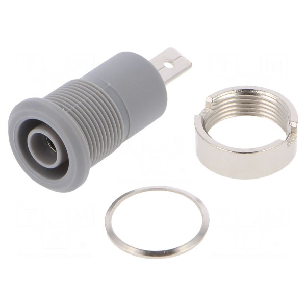 Element posiada niklowaną powierzchnię styku, która zapewnia stabilność połączenia. Montaż odbywa się metodą wciskaną lub lutowaną w otworze o średnicy 12,2mm. Obudowa złącza wykonana jest w kolorze szarym.
