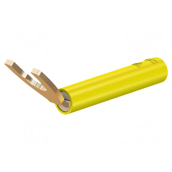 Konstrukcja bazuje na mosiężnym styku, który dla poprawy parametrów połączeniowych został poddany procesowi złocenia. Komponent charakteryzuje się prądem znamionowym 20A i spełnia wymogi bezpieczeństwa określone przez normę EN 61010 dla kategorii CAT II 1000V. Całkowita długość złącza wynosi 43,2mm, a element wyróżnia się żółtym kolorem obudowy.