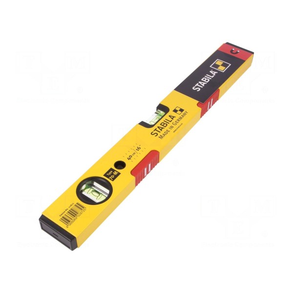 Poziomica o długości 0,4 m została wykonana z aluminium. Konstrukcja narzędzia uwzględnia libellę pionową oraz libellę poziomą, co umożliwia kontrolę ustawienia w dwóch płaszczyznach.