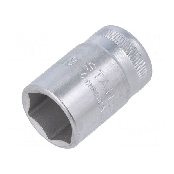 Nasadka 6-kątna o rozmiarze gniazda 18 mm przeznaczona jest do współpracy z narzędziami posiadającymi napęd 1/2". Model ten charakteryzuje się krótką konstrukcją o całkowitej długości 38 mm, co ułatwia pracę w miejscach o ograniczonej przestrzeni.