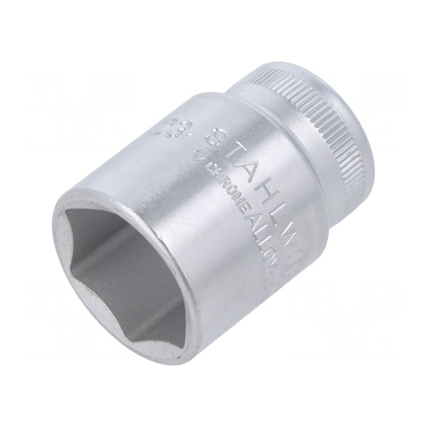 Nasadka sześciokątna o rozmiarze 23mm przeznaczona jest do współpracy z napędami o rozmiarze 1/2". Narzędzie wykonane jest ze stali chromowanej i posiada krótką konstrukcję o całkowitej długości 42mm.
