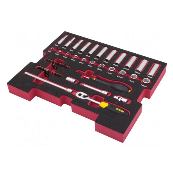 W zestawie: grzechotka 1/4", nasadki 6-kątne 1/4". Całość narzędzi dostarczana jest w dedykowanej wkładce piankowej, która umożliwia uporządkowane przechowywanie oraz transport elementów zestawu.