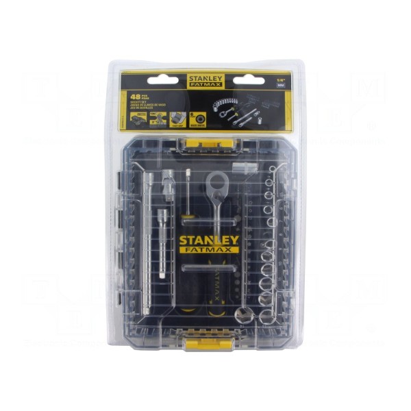 Zestaw narzędziowy STANLEY obejmuje 48 elementów typu klucz nasadowy 6-kątny. Komplet oparty jest na standardzie mocowania 1/4", co zapewnia kompatybilność z szerokim zakresem akcesoriów montażowych.