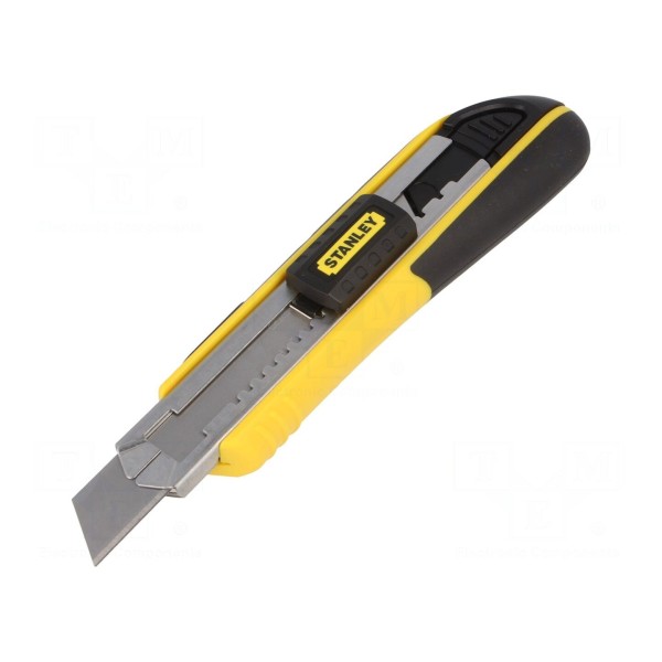 Uniwersalny nóż o długości całkowitej 180mm został wyposażony w system wysuwanego, łamanego ostrza o szerokości 18mm. Rękojeść wykonana jest z plastiku i posiada zintegrowany uchwyt do paska, co ułatwia przenoszenie narzędzia podczas pracy.