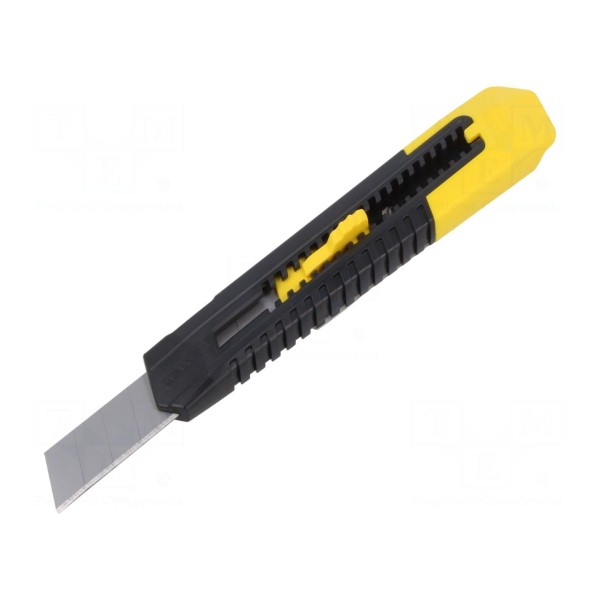 Nóż uniwersalny przeznaczony do prac wymagających precyzyjnego cięcia. Narzędzie zostało wyposażone w wysuwane, łamane ostrze o szerokości 18mm, co pozwala na szybkie odłamanie zużytego fragmentu i korzystanie z ostrej krawędzi roboczej. Długość całkowita noża wynosi 160mm.