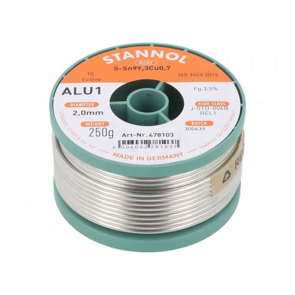 Drut lutowniczy bezołowiowy o składzie stopu Sn99,3Cu0,7, przeznaczony do lutowania miękkiego. Produkt charakteryzuje się średnicą 2 mm i dostarczany jest na szpuli o masie całkowitej 250 g.