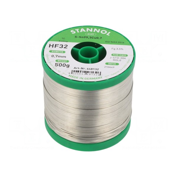 Spoiwo w postaci drutu lutowniczego o składzie Sn99,3Cu0,7 to bezołowiowy stop przeznaczony do lutowania miękkiego. Produkt charakteryzuje się średnicą 0,7 mm i jest dostępny w formie szpuli o masie całkowitej 0,5 kg. Temperatura topnienia dla tego stopu wynosi 227°C.