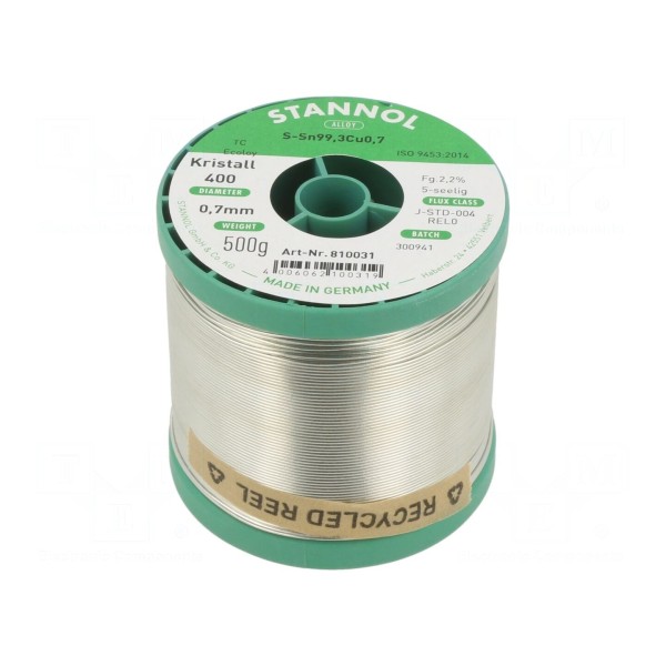 Spoiwo lutownicze w formie drutu o składzie stopu Sn99,3Cu0,7 przeznaczone jest do lutowania miękkiego. Produkt charakteryzuje się średnicą wynoszącą 0,7 mm i jest oferowany na szpuli o masie całkowitej 0,5 kg. Stop ten osiąga punkt topnienia w temperaturze 227°C.