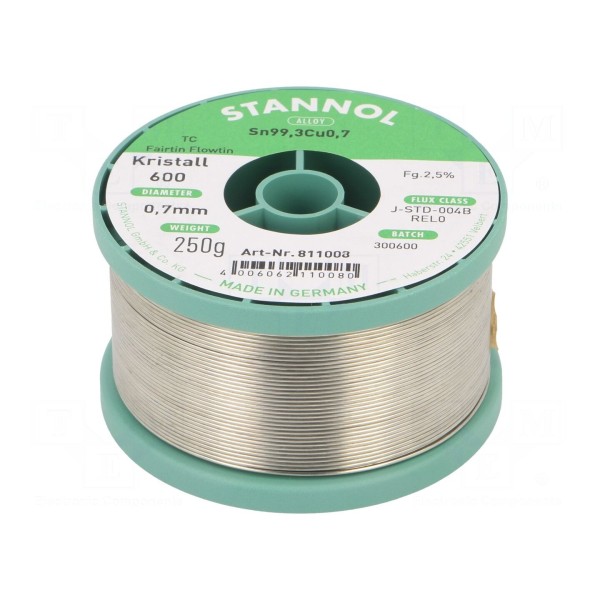 Spoiwo lutownicze w formie drutu o średnicy 0,7 mm przeznaczone do lutowania miękkiego. Produkt oparty jest na bezołowiowym stopie Sn99,3Cu0,7, znanym jako stop TC, co zapewnia wysoką jakość połączeń w procesach elektronicznych.