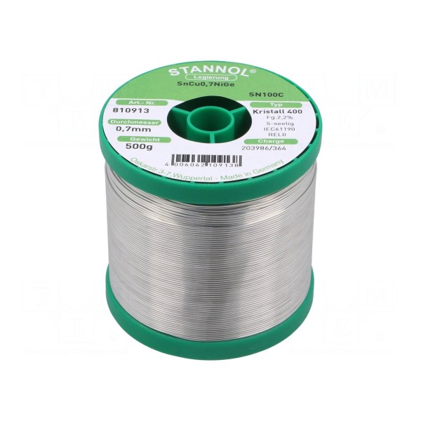 Spoiwo lutownicze w formie drutu o składzie Sn99,3Cu0,7+NiGe (SN100C®) przeznaczone jest do lutowania miękkiego. Produkt charakteryzuje się średnicą 0,7 mm i jest nawinięty na szpulę o masie całkowitej 0,5 kg. Temperatura topnienia tego stopu bezołowiowego wynosi 227°C.