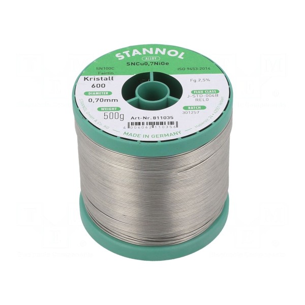 Spoiwo lutownicze w formie drutu o średnicy 0,7 mm składa się ze stopu Sn99,3Cu0,7+NiGe, znanego pod nazwą handlową SN100C. Produkt przeznaczony jest do lutowania miękkiego i dostarczany w postaci nawiniętej na szpuli o masie 0,5 kg. Jest to stop bezołowiowy, charakteryzujący się składem chemicznym zoptymalizowanym pod kątem stabilności połączeń lutowniczych.