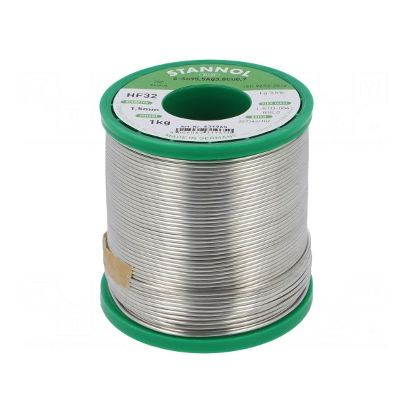 Bezołowiowy drut lutowniczy STANNOL o składzie stopu Sn95,5Ag3,8Cu0,7 charakteryzuje się temperaturą topnienia wynoszącą 217°C. Spoiwo przeznaczone jest do lutowania miękkiego i występuje w postaci drutu nawiniętego na szpulę o masie 1kg.