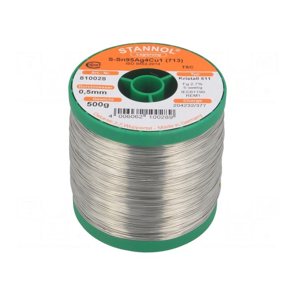 Bezołowiowy drut lutowniczy wykonany ze stopu Sn95,5Ag3,8Cu0,7, przeznaczony do lutowania miękkiego. Spoiwo posiada średnicę 0,5 mm i jest dostarczane na szpuli o masie całkowitej 0,5 kg.