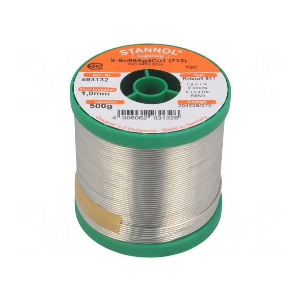 Spoiwo bezołowiowe w postaci drutu lutowniczego przeznaczone jest do lutowania miękkiego. Stop TSC o składzie Sn95,5Ag3,8Cu0,7 charakteryzuje się temperaturą topnienia wynoszącą 217°C. Średnica drutu wynosi 1mm, a produkt dostarczany jest na szpuli o masie 0,5kg.