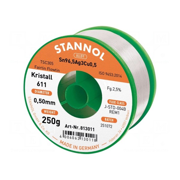 Bezołowiowy drut lutowniczy marki Stannol o składzie stopu Sn96,5Ag3Cu0,5 i średnicy 0,5 mm. Produkt przeznaczony jest do lutowania miękkiego, zapewniając właściwości stopu TSC305.