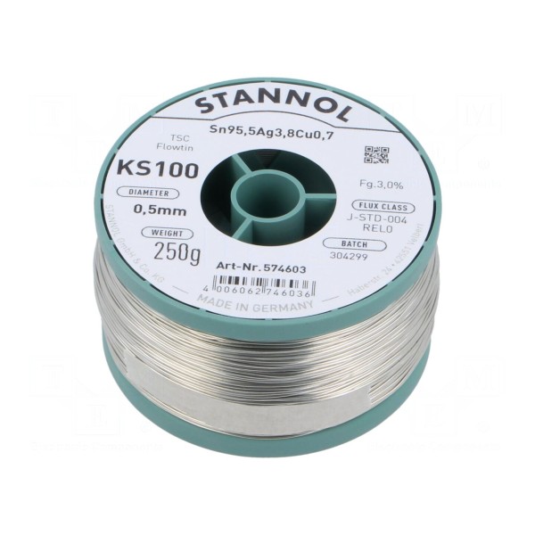 Bezołowiowy drut lutowniczy STANNOL KS100 wykonany jest ze stopu Sn95,5Ag3,8Cu0,7 (FLOWTIN TSC). Spoiwo przeznaczone jest do lutowania miękkiego i charakteryzuje się temperaturą topnienia wynoszącą 217°C.