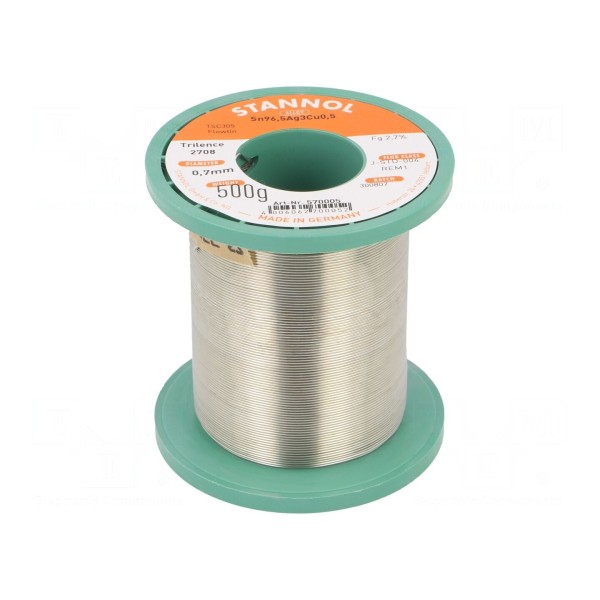 Bezołowiowy drut lutowniczy marki STANNOL o składzie stopu Sn96,5Ag3Cu0,5, znanym również jako TSC305, przeznaczony jest do lutowania miękkiego. Średnica przewodu wynosi 0,7 mm, co pozwala na precyzyjne nanoszenie spoiwa podczas prac montażowych. Produkt dostarczany jest na szpuli o masie całkowitej 500 g.