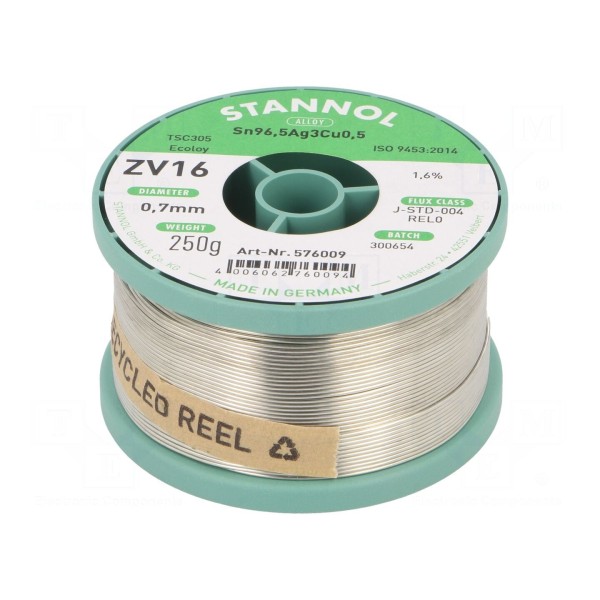 Spoiwo w postaci drutu lutowniczego o średnicy 0,7 mm jest przeznaczone do lutowania miękkiego. Produkt stanowi stop bezołowiowy o składzie Sn96,5Ag3Cu0,5 (TSC305), dostarczany w formie nawiniętej na szpuli o masie 250 g.