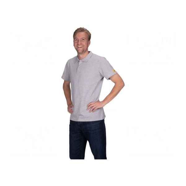 Koszulka polo marki STATICTEC została wykonana z mieszanki bawełny, poliestru oraz włókien przewodzących. Odzież typu unisex o gramaturze 180g/m² posiada właściwości rozpraszające ładunki elektrostatyczne. Produkt utrzymany jest w szarym kolorze i dostępny w rozmiarze XXL.