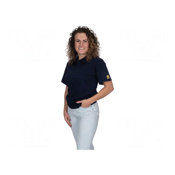 Koszulka polo w kolorze granatowym została wykonana z mieszanki bawełny, poliestru oraz włókien przewodzących. Odzież typu unisex posiada gramaturę 180g/m² i przeznaczona jest do stosowania w środowiskach wymagających ochrony przed wyładowaniami elektrostatycznymi.