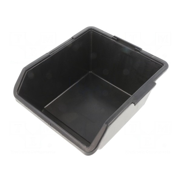 Pojemnik w kolorze czarnym posiada wymiary zewnętrzne wynoszące 125mm szerokości, 65mm wysokości oraz 130mm długości. Produkt znajduje zastosowanie w serwisach, magazynach, warsztatach oraz zakładach produkcyjnych, ułatwiając organizację małych elementów elektronicznych i mechanicznych.