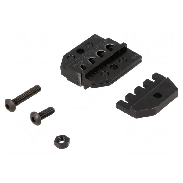 Szczęki do zaciskania przeznaczone są do obróbki konektorów nieizolowanych typu TAB o wymiarze 2,8 mm. Element pozwala na pracę z przewodami o przekroju w zakresach 0,5–1 mm² oraz 1,5–2,5 mm².