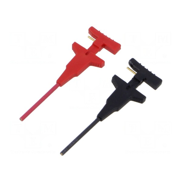 Zestaw zawiera dwie końcówki pomiarowe typu klips o średnicy 0,5 mm. Elementy te przeznaczone są do wykonywania precyzyjnych połączeń pomiarowych w układach elektronicznych.