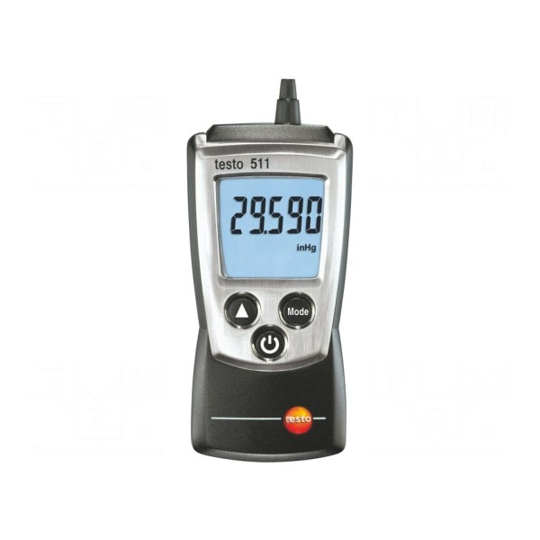 Manometr TESTO 511 to urządzenie służące do pomiaru ciśnienia w zakresie od 0,3 do 1,2 bar. Wyniki pomiarów mogą być prezentowane w szerokim wachlarzu jednostek, takich jak hPa, mbar, Pa, psi, in Hg, in H2O, mm Hg oraz mm H2O, przy zachowaniu dokładności na poziomie ±3hPa. Przyrząd został wyposażony w czytelny wyświetlacz LCD z funkcją podświetlenia, co umożliwia pracę w różnych warunkach oświetleniowych. Urządzenie oferuje funkcję barometrycznej kalkulacji ciśnienia powietrza.