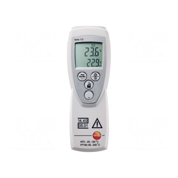 Miernik temperatury TESTO 112 to urządzenie cyfrowe przystosowane do pracy z czujnikami typu NTC oraz Pt100. Przyrząd obsługuje jeden kanał pomiarowy i umożliwia odczyt wartości w zakresie od -50°C do 300°C z rozdzielczością pomiaru 0,1°C.