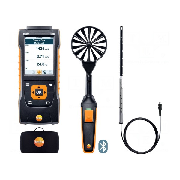 Miernik warunków środowiskowych TESTO 440-CKIT1 to zestaw przeznaczony do wszechstronnych pomiarów temperatury, ciśnienia oraz prędkości przepływu powietrza. Urządzenie oferuje zakres pomiarowy temperatury od -40°C do 150°C, a w przypadku zastosowania termopary typu K zakres ten rozszerza się do przedziału od -200°C do 1370°C. Pomiary prędkości przepływu realizowane są w zakresie do 35m/s z rozdzielczością 0,01m/s, natomiast pomiar ciśnienia obejmuje przedział 700–1100Pa.