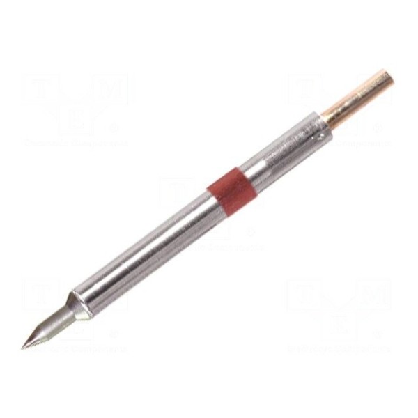 Grot lutowniczy typu stożek posiada zintegrowaną grzałkę, co umożliwia bezpośrednie przekazywanie energii cieplnej do miejsca lutowania. Średnica końcówki wynosi 0,2mm, co pozwala na precyzyjne operacje na elementach o małych wymiarach.