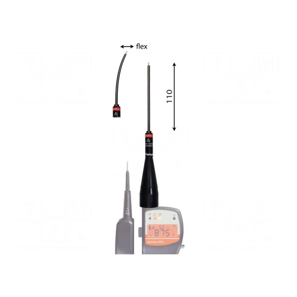 Końcówka pomiarowa przeznaczona jest do pracy przy napięciach znamionowych do 1kV. Element charakteryzuje się długością wynoszącą 0,11m, co umożliwia dostęp do punktów pomiarowych w instalacjach elektrycznych.