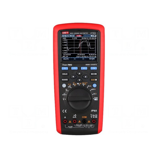 Multimetr cyfrowy UNI-T UT181A to przyrząd pomiarowy wyposażony w kolorowy wyświetlacz LCD o rozdzielczości 60000 z funkcją bargrafu. Urządzenie umożliwia pomiar napięcia DC (do 1kV) i AC, natężenia prądu DC i AC (do 10A), rezystancji, pojemności, częstotliwości (do 60MHz), szerokości impulsu oraz temperatury. Wykorzystuje technikę pomiaru True RMS, co zwiększa wiarygodność wyników w obwodach o przebiegach niesinusoidalnych. Przyrząd oferuje funkcje rejestracji danych TrendCapture, filtr dolnoprzepustowy oraz tryby MIN/MAX/AVG.