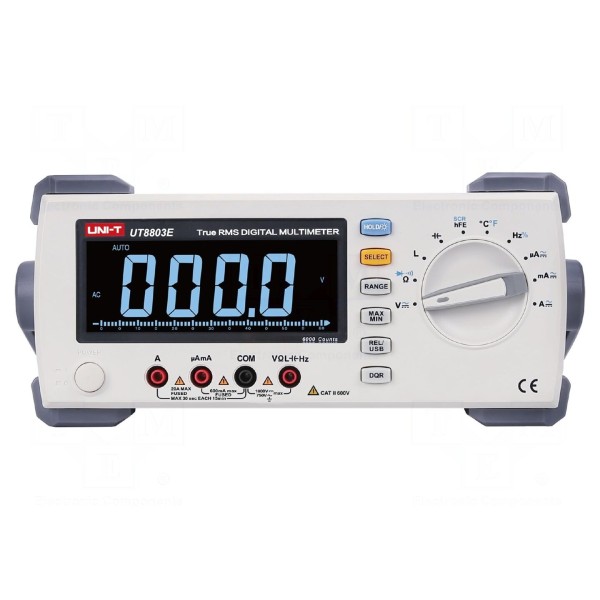 UNI-T UT8803E to stacjonarny multimetr wyposażony w wyświetlacz typu EBTN o rozdzielczości 3,5 cyfry (6000). Urządzenie obsługuje pomiar rzeczywistej wartości skutecznej (True RMS) dla napięcia i prądu przemiennego. Przyrząd umożliwia pomiar napięcia DC do 1kV, napięcia AC do 750V oraz prądu w zakresie do 10A. Dokładność pomiaru napięcia DC wynosi ±(0,3% + 2 digit), natomiast dla napięcia AC jest to ±(0,6% + 5 digit).