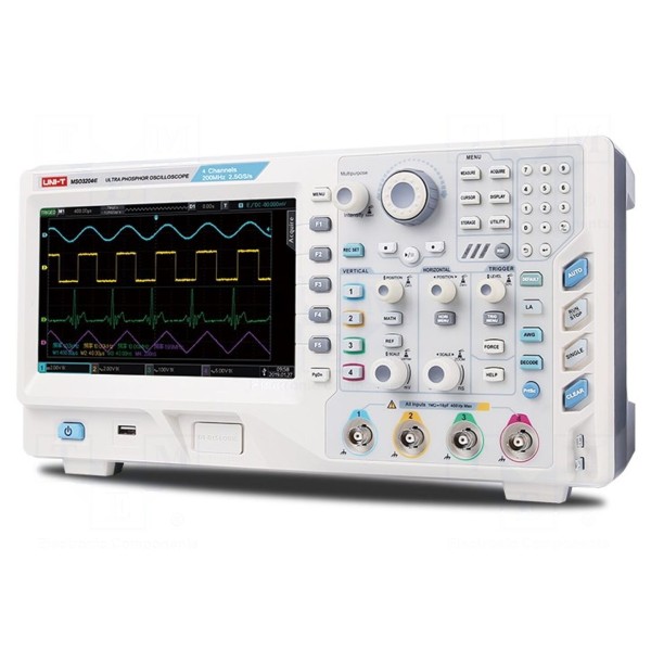 Cyfrowy oscyloskop UNI-T MSO3252E oferuje pasmo przenoszenia 250MHz oraz dwa kanały pomiarowe. Urządzenie charakteryzuje się częstotliwością próbkowania na poziomie 2,5Gsps przy długości rekordu pamięci 70Mpts. Sygnały prezentowane są na wyświetlaczu LCD TFT o przekątnej 8 cali i rozdzielczości 800x480 pikseli. Przyrząd dysponuje czułością wejściową od 1mV/dz do 20V/dz oraz podstawą czasu regulowaną w zakresie od 2ns/dz do 40s/dz.