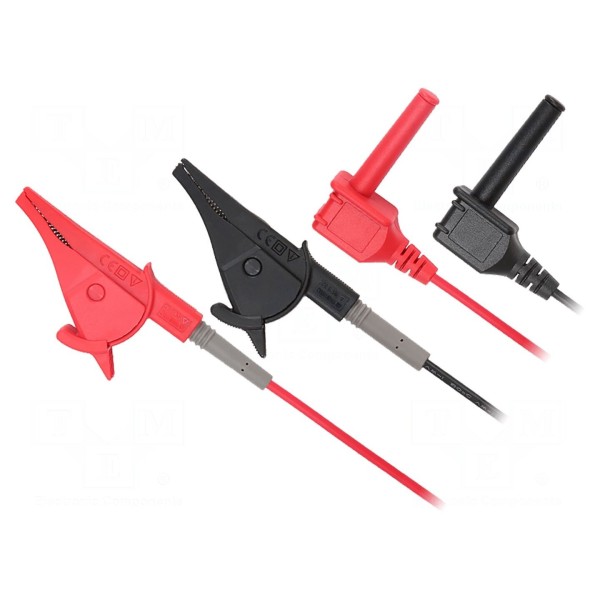 Zestaw zawiera przewody pomiarowe w kolorach czarnym oraz czerwonym. Konstrukcja końcówek obejmuje kątowy wtyk bananowy o średnicy 4mm oraz zacisk krokodylkowy.
