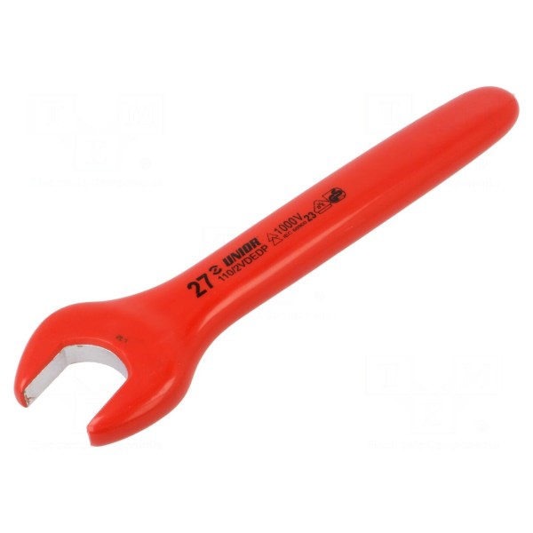 Klucz płaski izolowany UNIOR przeznaczony jest do prac z elementami złącznymi o rozmiarze 27mm. Konstrukcja jednostronna urządzenia umożliwia operowanie w miejscach wymagających płaskiego profilu głowicy.