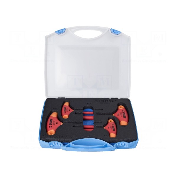 Zestaw zawiera cztery izolowane klucze typu imbus z rękojeścią w kształcie litery T. Narzędzia przeznaczone są do pracy z wkrętami typu HEX w rozmiarach 4 mm, 5 mm, 6 mm oraz 8 mm.