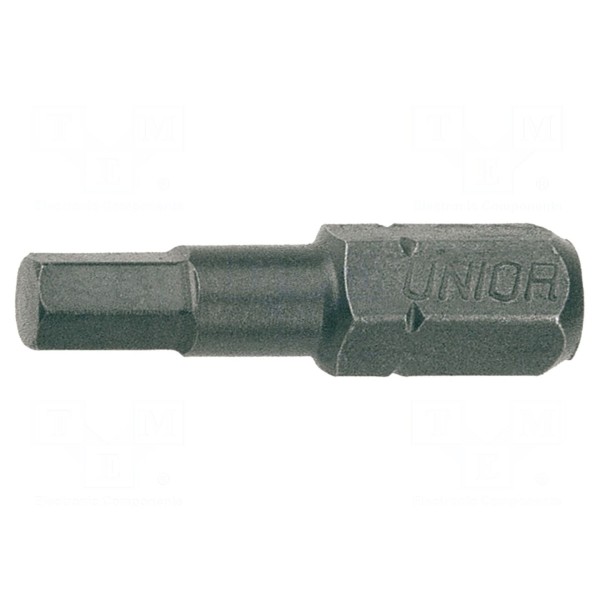 Końcówka wkrętakowa z grotem typu imbus w rozmiarze HEX 2,5 mm przeznaczona jest do pracy z elementami złącznymi z gniazdem sześciokątnym. Produkt posiada uchwyt w standardzie 1/4" (C6,3 mm), co umożliwia jego zastosowanie w standardowych wkrętarkach oraz uchwytach narzędziowych. Całkowita długość elementu wynosi 25 mm.