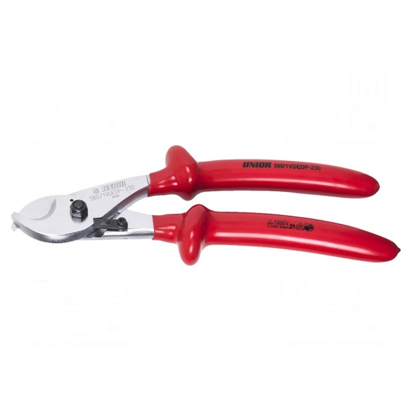 Nożyce przeznaczone są do cięcia kabli. Narzędzie posiada izolowaną konstrukcję, co umożliwia pracę przy instalacjach elektrycznych zgodnie z wymaganiami bezpieczeństwa.