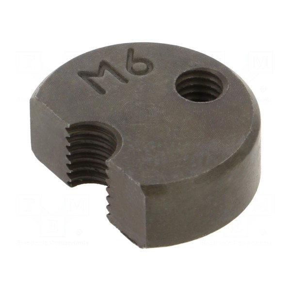 Element wyposażony jest w gwint o rozmiarze M6, zgodny ze specyfikacją techniczną urządzenia głównego. Produkt służy do bezpośredniej wymiany zużytego ostrza w nożycach serii 586/6.