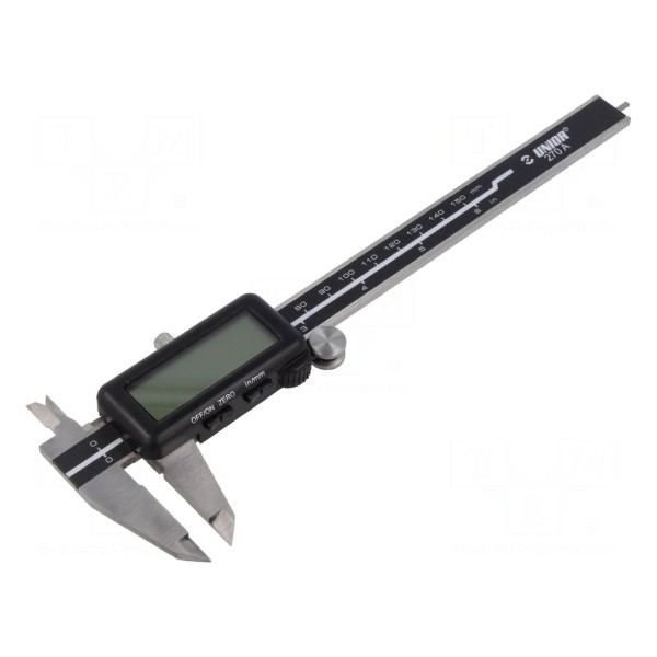 Suwmiarka UNIOR 619881 to narzędzie pomiarowe wyposażone w moduł elektroniczny z wyświetlaczem LCD. Umożliwia dokonywanie pomiarów zewnętrznych, wewnętrznych oraz pomiarów głębokości w zakresie do 150 mm (6 cali). Sposób pomiaru eliminuje błędy odczytu, zapewniając użytkownikowi dostęp do precyzyjnej skali metrycznej oraz calowej.