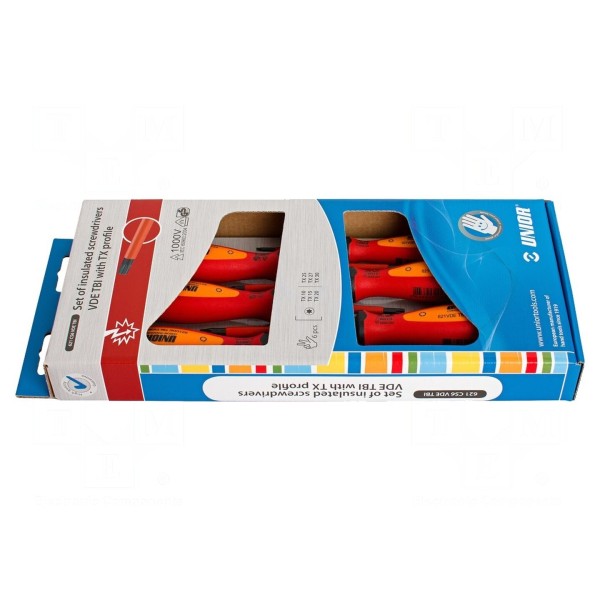 Zestaw składa się z sześciu izolowanych wkrętaków typu Torx o rozmiarach TX10, TX15, TX20, TX25, TX27 oraz TX30. Narzędzia zostały wykonane ze stali chromowo-wanadowej, a końcówki ostrzy poddano procesowi czernienia.