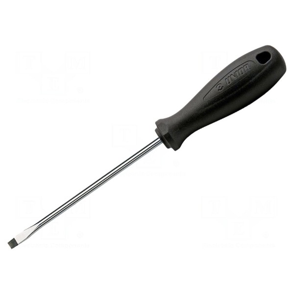 Wkrętak standardowy z grotem płaskim o wymiarach 10x1,6mm przeznaczony jest do prac montażowych. Ostrze wykonano ze stali chromowo-wanadowej, co zapewnia trwałość narzędzia podczas eksploatacji. Końcówka robocza została poddana procesowi czernienia, natomiast powierzchnia samego ostrza jest chromowana.